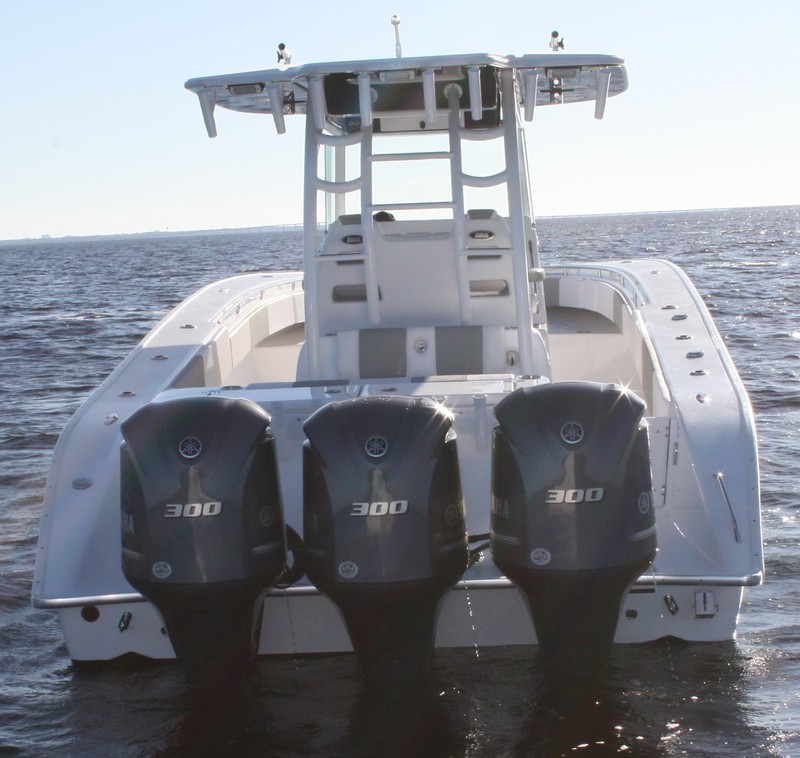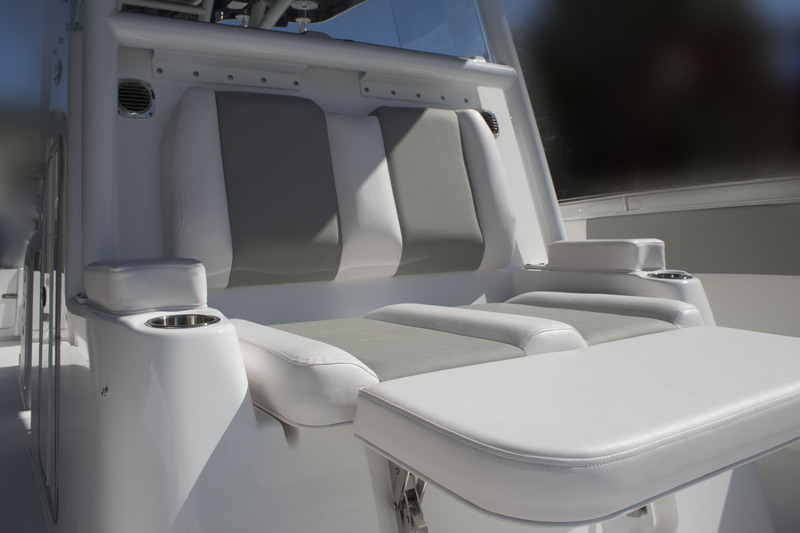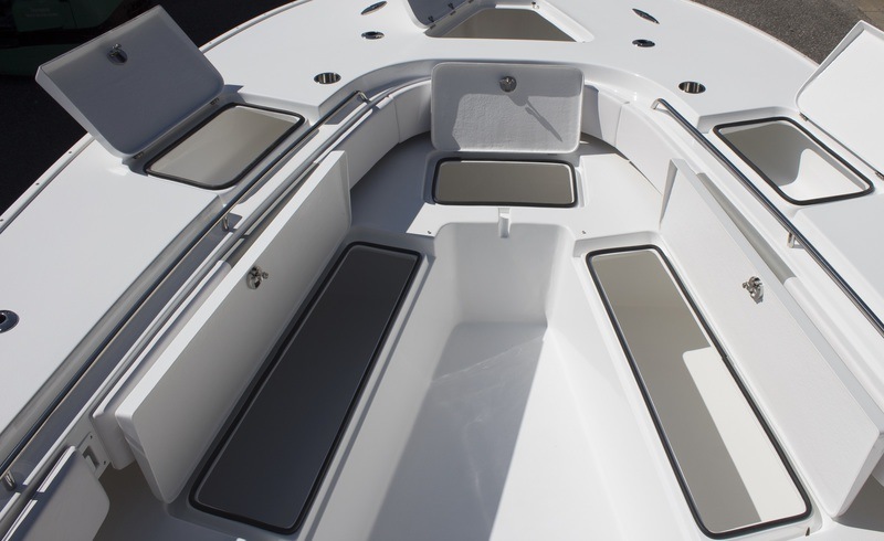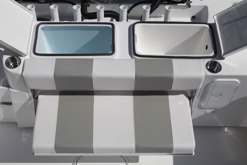 A huge dash provides plenty of room for multiple large screen displays. Additional storage is discovered in the huge walk-in console. A drink cooler is offered beneath the flip up front seat that quickly transforms into a lounge seat with a flip-up foot rest. A 9’ fully insulated fish box offers 1400 quarts of frozen storage that is pumped overboard during cleanup.