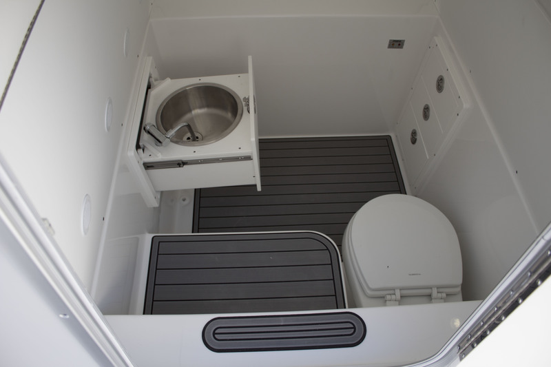 Expand your destination possibilities. Whether exploring the canyons or entertaining a group the 36XS has you covered. The helm station wraps the driver and passengers in bolstered seats and provides generous drawers and compartments for all tackle/storage needs. The rear facing seat conceals a huge 60 gal. live well. An additional 20 gal. well in the transom doubles as a storage box when needed. A large, rear fold-away bench and forward lounge entertain the crew. An optional vacu-flush head can be placed in the console next to the concealed pull out stainless sink. The EPS steering allows easy upgrade to joystick control.
